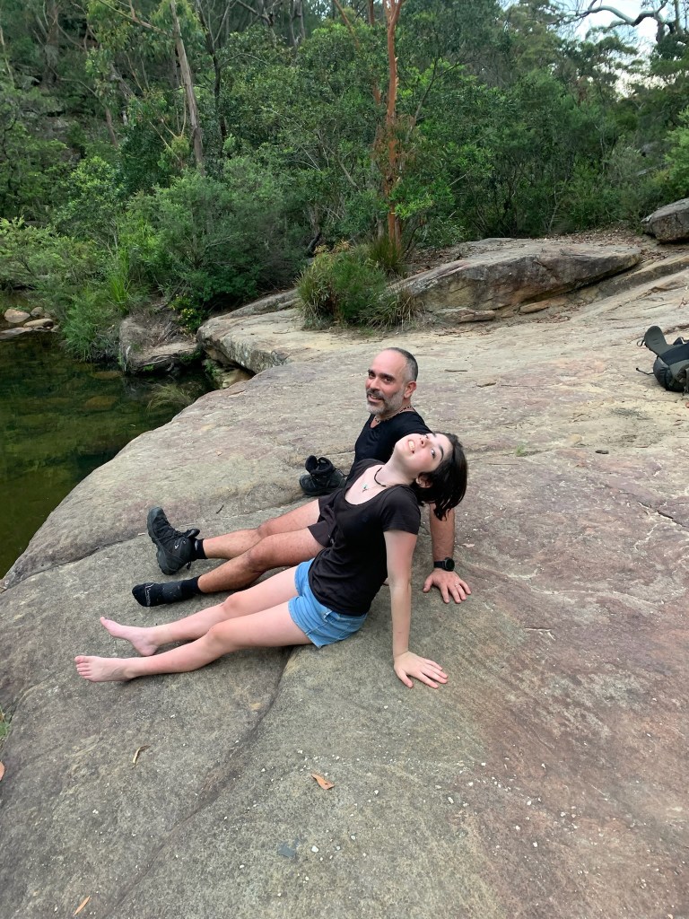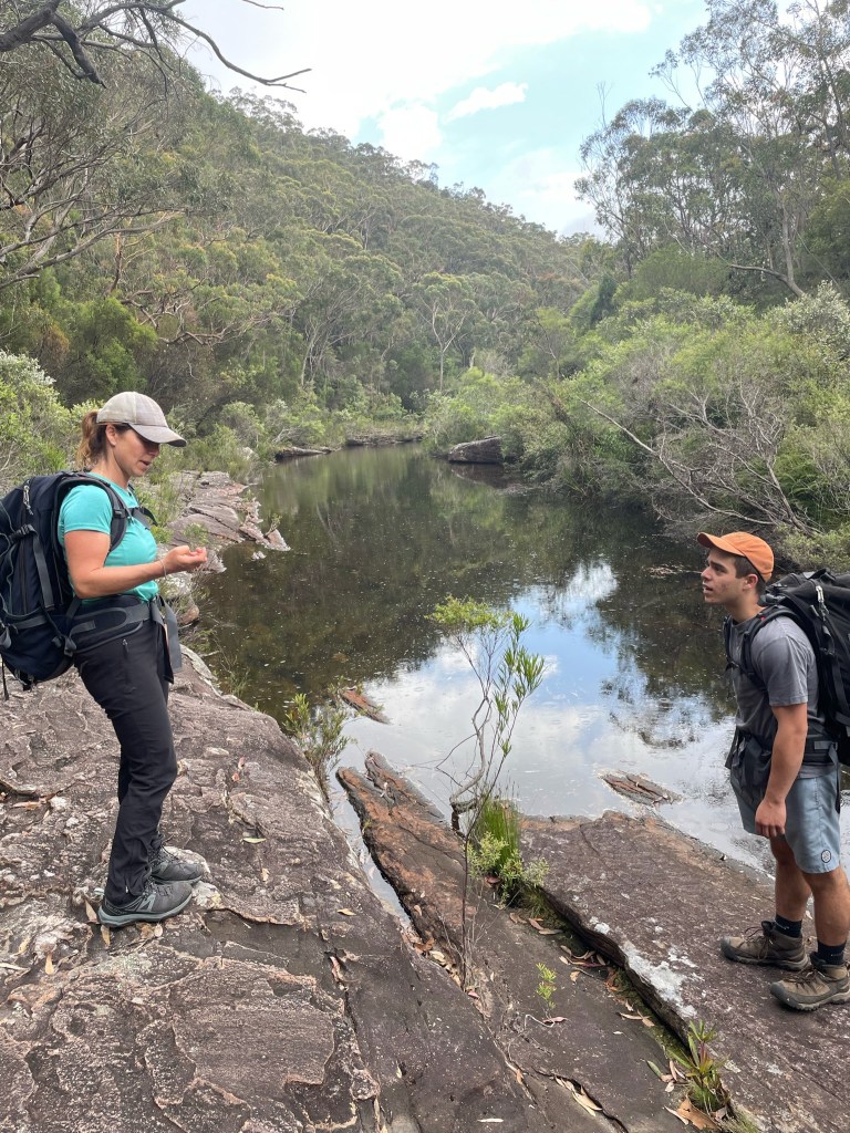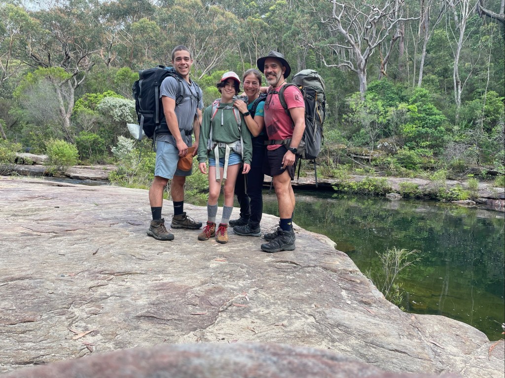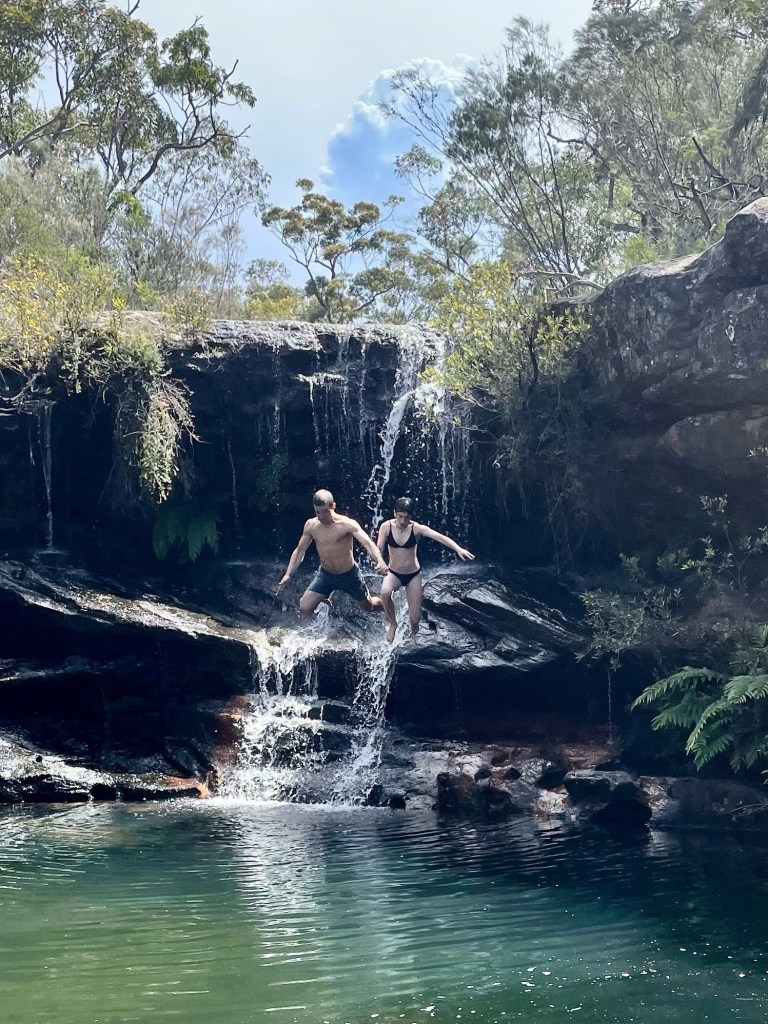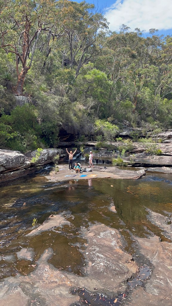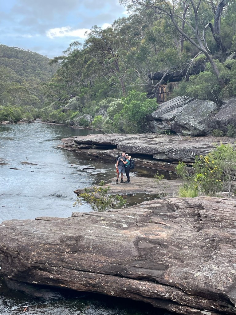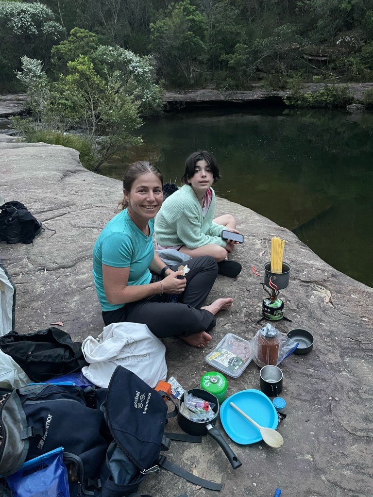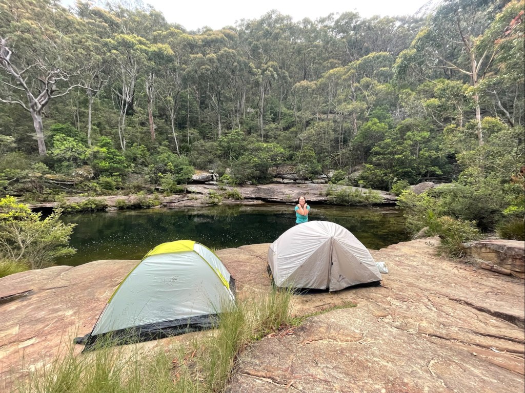 With 29 degree sunshine forecast for Day 1 and storms for Day 2, I decided we should shake it up and walk to Uloola via Kangaroo Creek track (I heard of many great swim spots along the way) and then back on Day 2 via the easier graded Uloola Track (the recommended route there). Not much went to plan from there! Day 1 (Xmas Day) started from Waterfall train station 2 hours later than planned (at 2pm!). Instead of Uloola Track, we walked on the far less trodden Kangaroo Creek Track. It starts easily enough and after an hour you get to the magnificent Kangaroo Pool – a beautiful swim spot with a waterfall and jump spot. The kids loved it. Between the hour spent here and 2pm start, we only had 3 hours of daylight left to walk 5km’s to Uloola camp site (via Karloo pools). But, we seriously underestimated how overgrown the bush was, often having to backtrack and course correct. By 7pm, it became clear we wouldn’t be reaching Uloola as we muddled and bush bashed through thick bush, finally to arrive to an empty Karloo pools at 7.30pm. We set up camp here instead. Day 2 (Boxing Day) we decided should be easier given the crazy rush in Day 1. So we hiked a kilometre or so to the massive (and empty) Olympic Pool, which is spectacular. From there we took the Bottle Forest Track up to Heathcote, which involved an hour or so of steep gradient ascent. All in all, an amazing hike and would definitely suggest all day is needed to fully enjoy and explore Kangaroo Creek allowing for enough time to work through the overgrown bush.