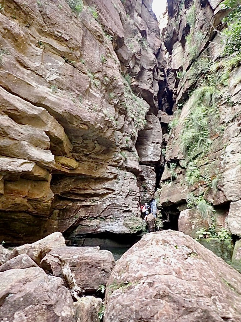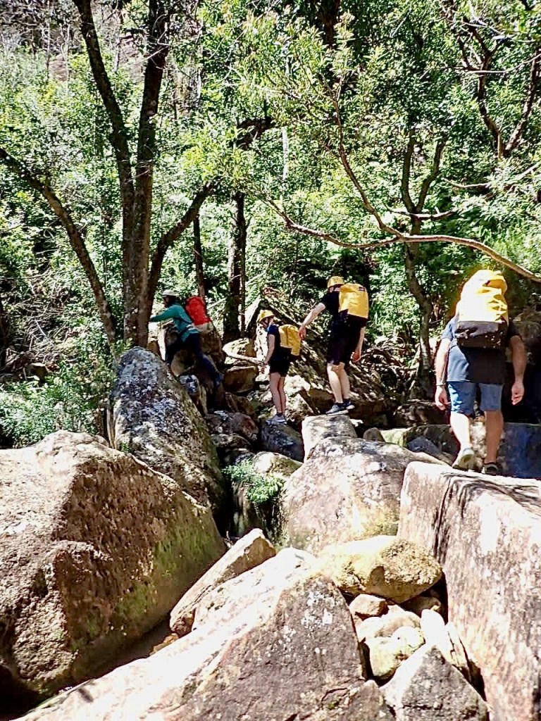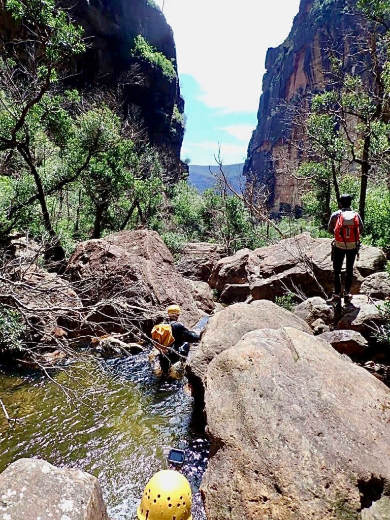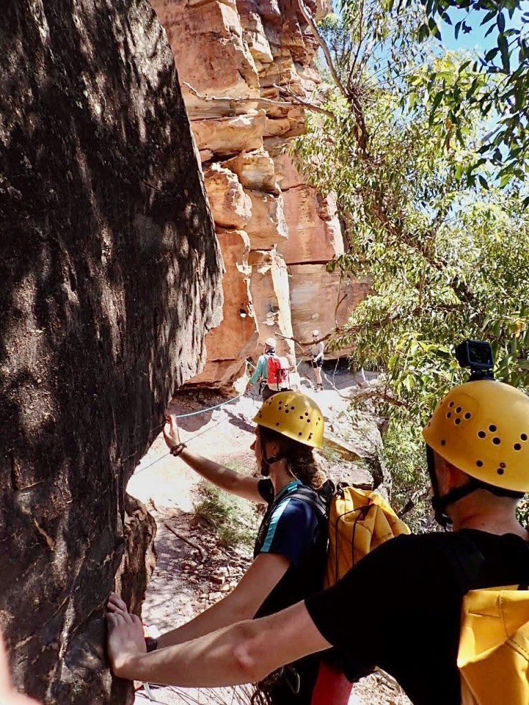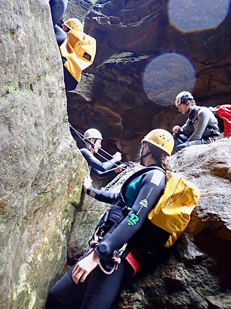 The climb out of canyons can sometimes be a bit boring … not so here! The 2 hour hike out, along a narrow wedge of a path on the cliff edge, involves full on rock climbing up a section – not for the faint hearted.